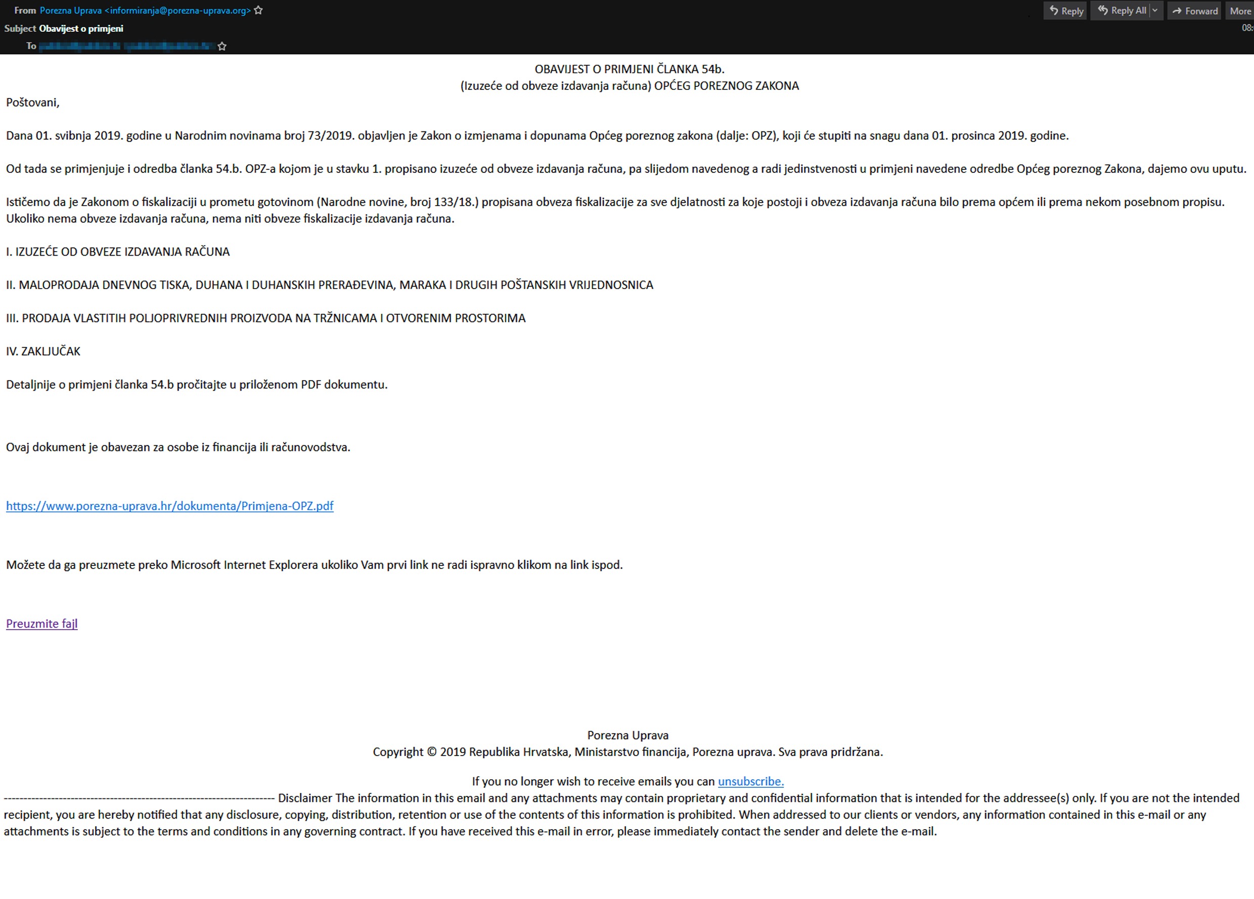 Pošiljatelj poruke predstavljao se kao Porezna uprava, a poruke je slao s adrese elektroničke pošte informiranja@porezna-uprava.org. Poruka je naslovljena “Obavijest o primjeni“, a u tekstu poruke se korisnika pozivalo na otvaranje phishing URL-a. Phishing URL nalazio se na lažnoj domeni “porezna-uprava.org“.