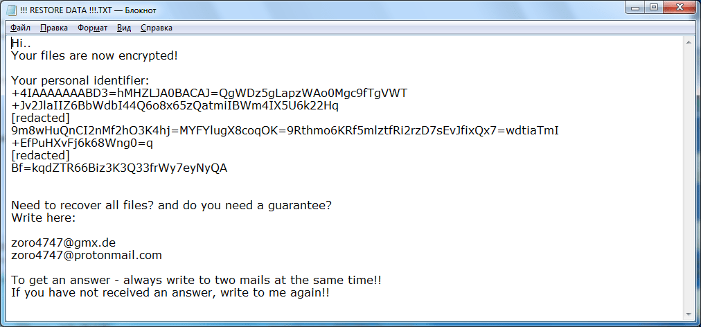 Sigurnosni stručnjak Amigo-A pronašao je novu inačicu ransomwarea Scarab koja dodaje nastavak .zoro i ostavlja ucjenjivačku poruku naziva !!! RESTORE DATA !!!.TXT.