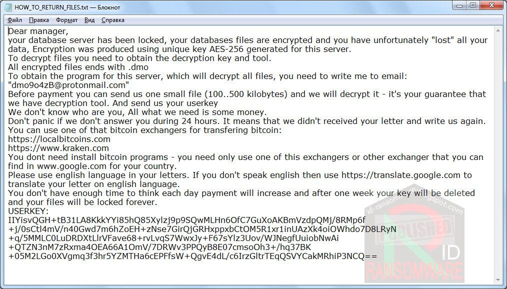 Sigurnosni stručnjak Amigo-A pronašao je novu inačicu ransomwarea Ransomnix koja dodaje nastavak .dmo i ostavlja ucjenjivačku poruku HOW_TO_RETURN_FILES.txt.