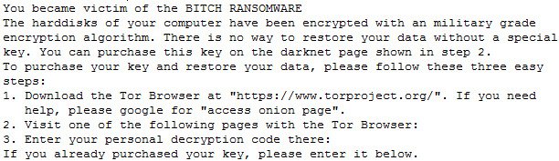 Sigurnosni stručnjaci iz MalwareHunterTeama pronašli su novi ransomware koji sam sebe naziva „Bitch Ransomware“.