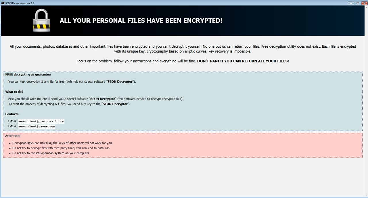 Sigurnosni stručnjak Petrovic pronašao je inačicu 0.2 ransomwarea SEON.
