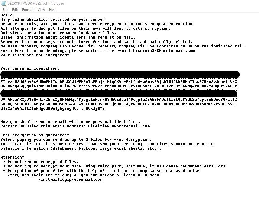 Sigurnosni stručnjak GrujaRS pronašao je novu inačicu ransomwarea Scarab koja dodaje nastavak .li šifriranim datotekama i ostavlja ucjenjivačku poruku naziva DECRYPT YOUR FILES.TXT.