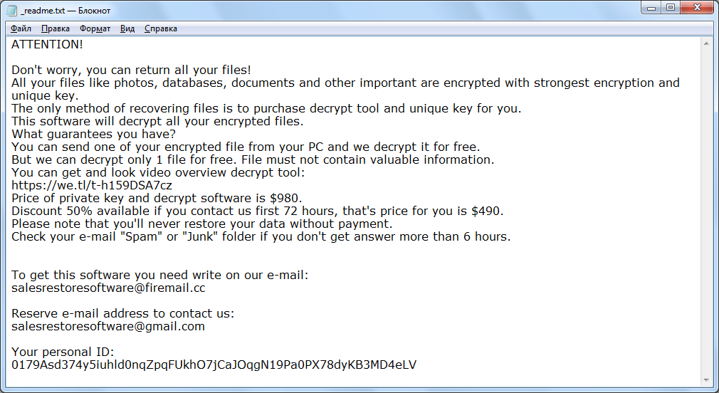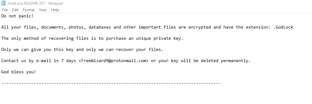 Sigurnosni stručnjak GrujaRS pronašao je novu inačicu ransomwarea FreeMe koja dodaje nastavak .GodLock i ostavlja ucjenjivačku poruku naziva .GodLock.README.TXT.