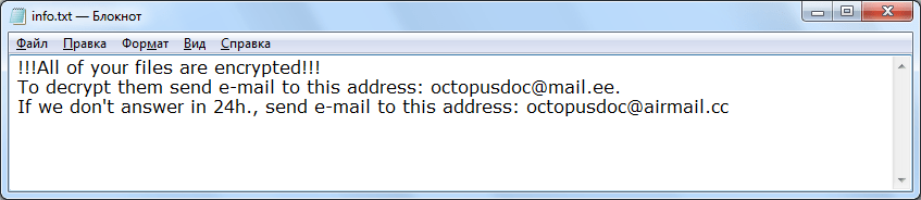 Sigurnosni stručnjak Amigo-A pronašao je novu inačicu ransomwarea Phobos koji dodaje nastavak .octopus šifriranim datotekama i ostavlja ucjenjivačku poruku naziva info.txt.