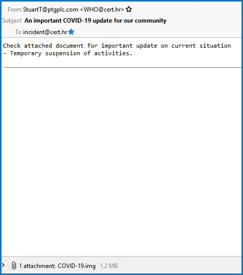 Prošli tjedan smo pozvali na dodatan oprez zbog mogućnosti pojave phishing kampanja vezane uz COVID-19. Trenutno je aktivna jedna kampanja ovog tipa, a napadač se predstavlja kao Svjetska zdravstvena organizacija (WHO). “From” polje se lažira ovisno o primatelju (npr. WHO@cert.hr). U privitku poruke elektroničke pošte nalazi se naizgled .img datoteka