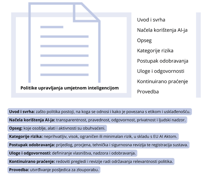 Slično tome, EU AI Act, iako ne koristi izričito pojam “politika”, propisuje obveze u području s transparentnošću, upravljanjem rizicima, upravljanjem podacima i ljudskim nadzorom. U praksi se te obveze ne mogu ispuniti bez jasnih internih pravila i procedura.