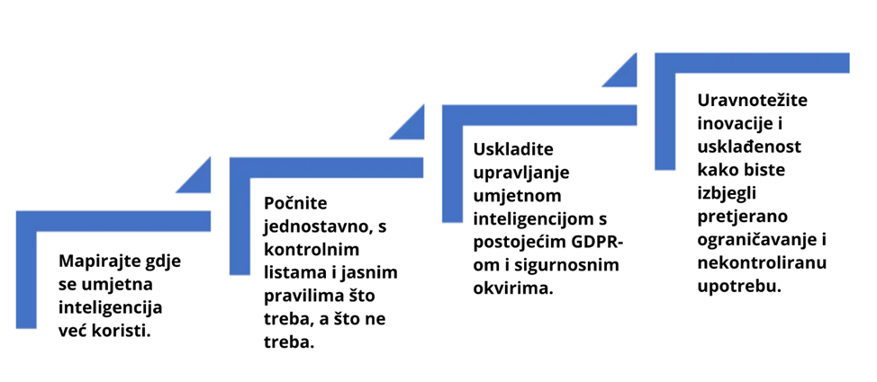 Za institucije koje tek započinju s uvođenjem AI politika, preporučuje se da krenu s nekoliko jednostavnih koraka: