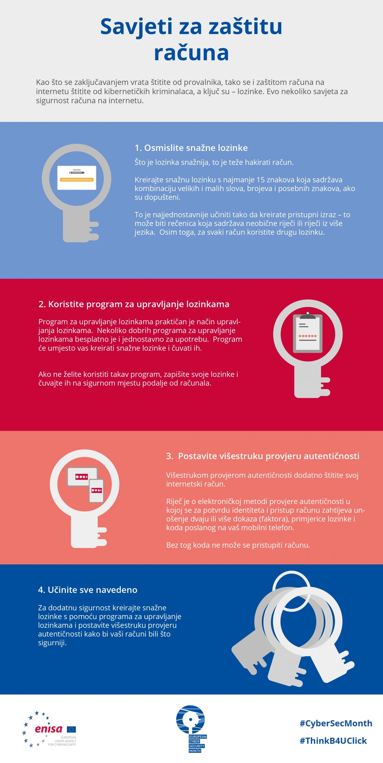 S ciljem zaštite svog doma zaključavamo protuprovalna vrata, zatvaramo prozore, spuštamo rolete i zavjese, a što činimo za zaštitu svog digitalnog identiteta u kibernetičkom prostoru? Najbolji ključevi su snažne lozinke, njihovo čuvanje, održavanje i dodatni lokot kojim dokazujete svoj identitet.
