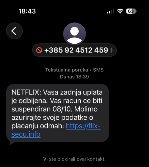 Nacionalni CERT zaprimio je nekoliko prijava prijevare u kojoj se napadači predstavljaju kao Netflix. Napadači korisnicima šalju poruke s tvrdnjom da je “zadnja uplata odbijena” te da će korisnički račun biti suspendiran ako se odmah ne ažuriraju podaci o plaćanju.