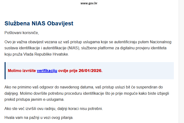 Poveznice koje i izgledom oponašaju službenu stranicu sustava e-Građani šire se putem elektroničke pošte kao „Službena NIAS Obavijest“.